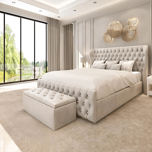 The Durham Chesterfield bed comes in luxurious champagne colour velvet fabric upholstery as shown. However, we have a range of fabric choices and colour schemes. So, you can go for the overall space’s interior and choose the best colour combo for that. In addition, fabric choices also depend upon our valued customers. In short, the final product’s upholstering fabrics and paneling choices, and colour scheme depend on them.