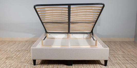 The Falmouth upholstered bed frame with border lines headboard comes has a spacious gas lift ottoman storage option. This storage is enough to conceal any of the toys, books, and random stuff. Other base options include a wooden slate base that comes with no storage but adds durability to the product. In addition, divan storage with 2 drawers for single beds and 4 drawers for double beds is also available. Customers can also go for a board base with no storage.