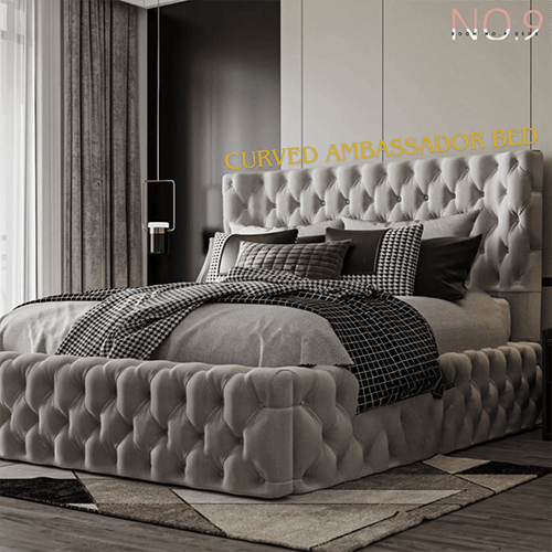 Queen Mary's upholstered ambassador bed frame comes with a pillow headboard. Added diamond button and matching buttons option makes it look shiny, charming, and unique. With a straight, broad Chesterfield-designed headboard, various headboard height variations are available depending on our customers’ preferences. The headboard heights may range from 50 inches to 90 inches from the foot to the top of the headboard.